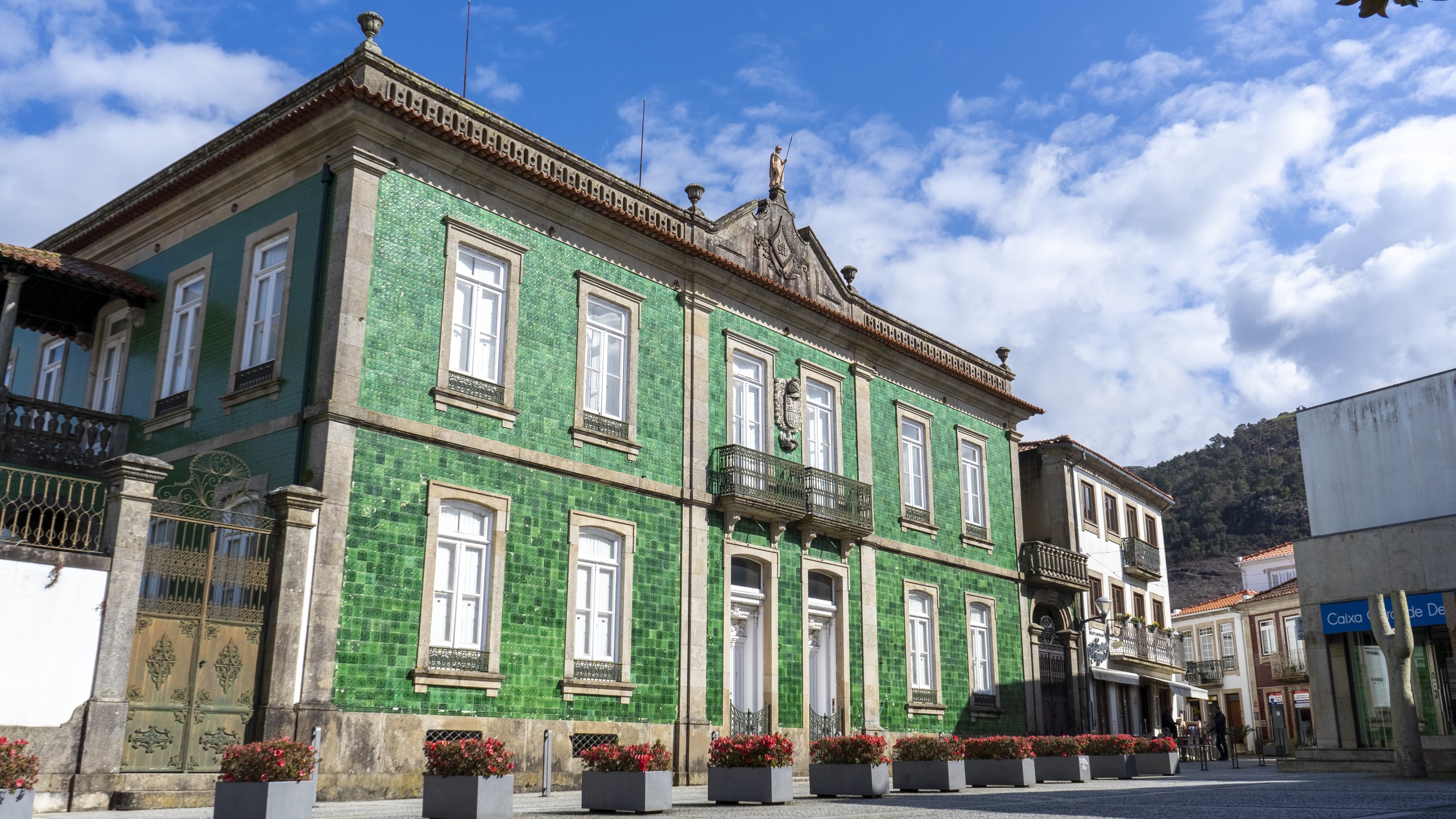 Imponente construção apalaçada, final do século XIX de estilo brasileiro, que se desdobra em rés-do-chão, primeiro andar e águas furtadas. A fachada exterior está coberta por azulejos de tonalidade esverdeada e a platibanda recortada, coroada de cráteras em granito, com um guerreiro romano, em faiança branca a ocupar a parte central.
