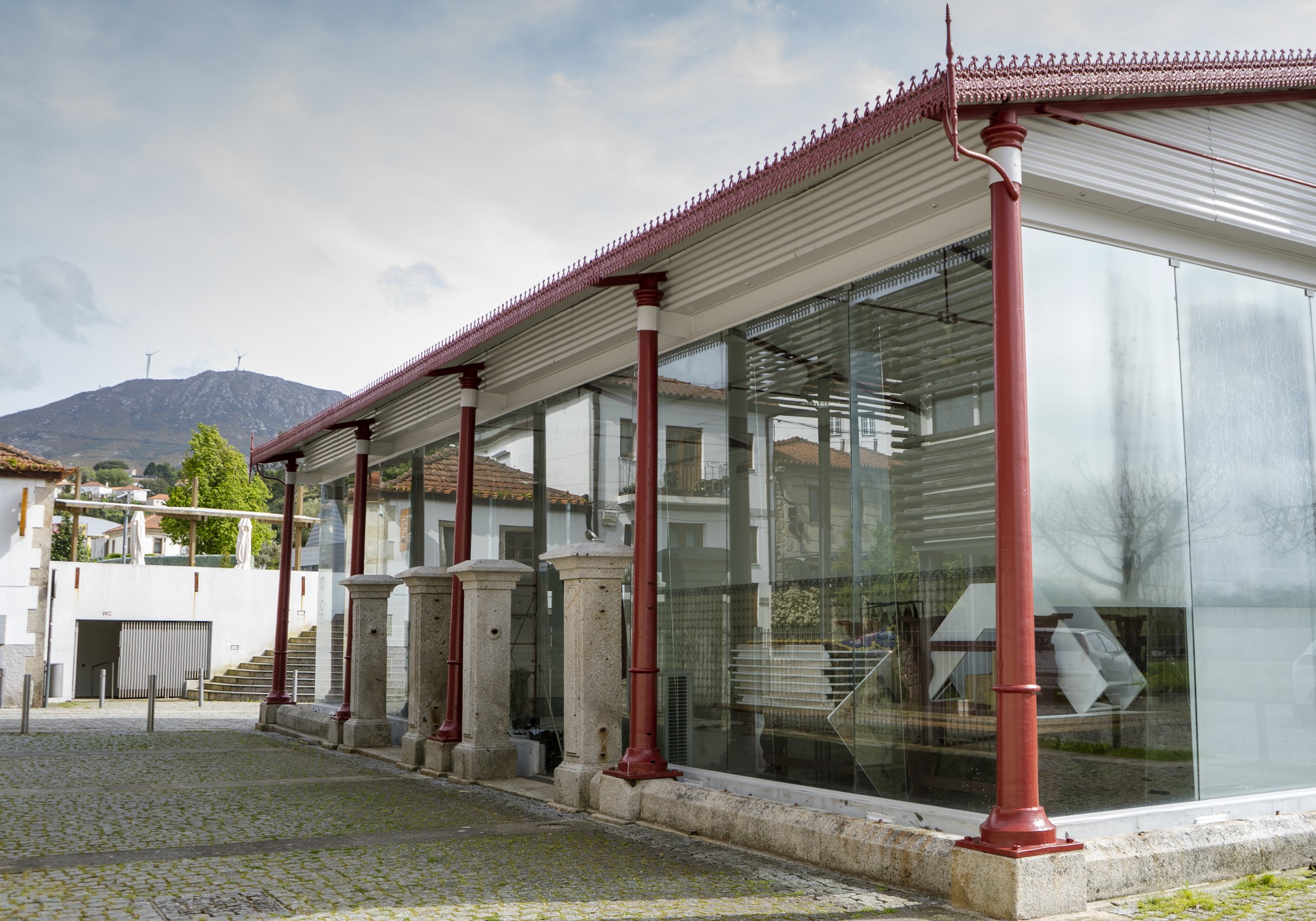 A cobertura, inteiramente metálica, assenta em asnas suportadas por colunas em ferro fundido de secção circular. A base destas, em placa quadrada, encontra-se fixa ao embasamento em granito, interrompido na entrada, a norte, onde se abrem dois portões delimitados por jambas também graníticas.