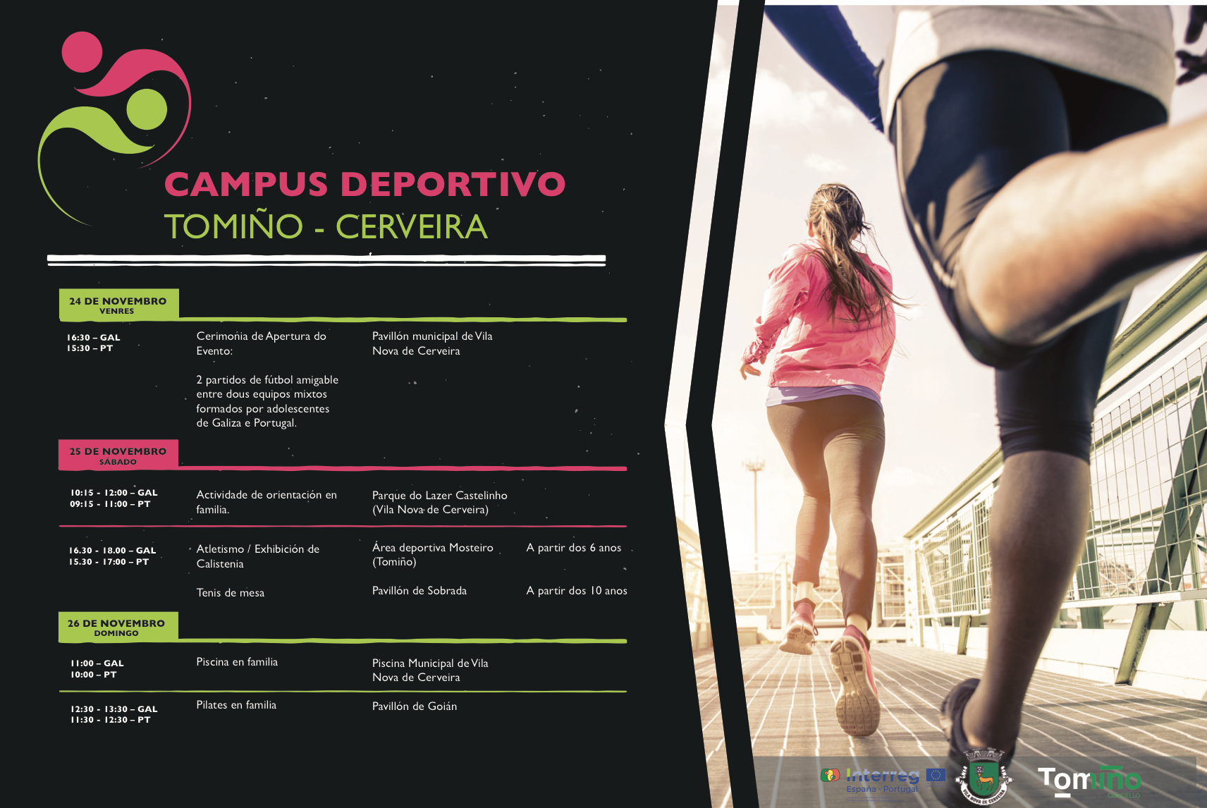 No dia seguinte, 25 de novembro, a manhã fica reservada para uma atividade de orientação em família no Parque do Lazer Castelinho, em Vila Nova de Cerveira. No período da tarde, a iniciativa volta ao concelho de Tomiño, para acolher uma ação de atletismo e uma exibição de ‘calistenia’ na área desportiva de Mosteiro e outra de ténis de mesa no Pavilhão de Sobrada.