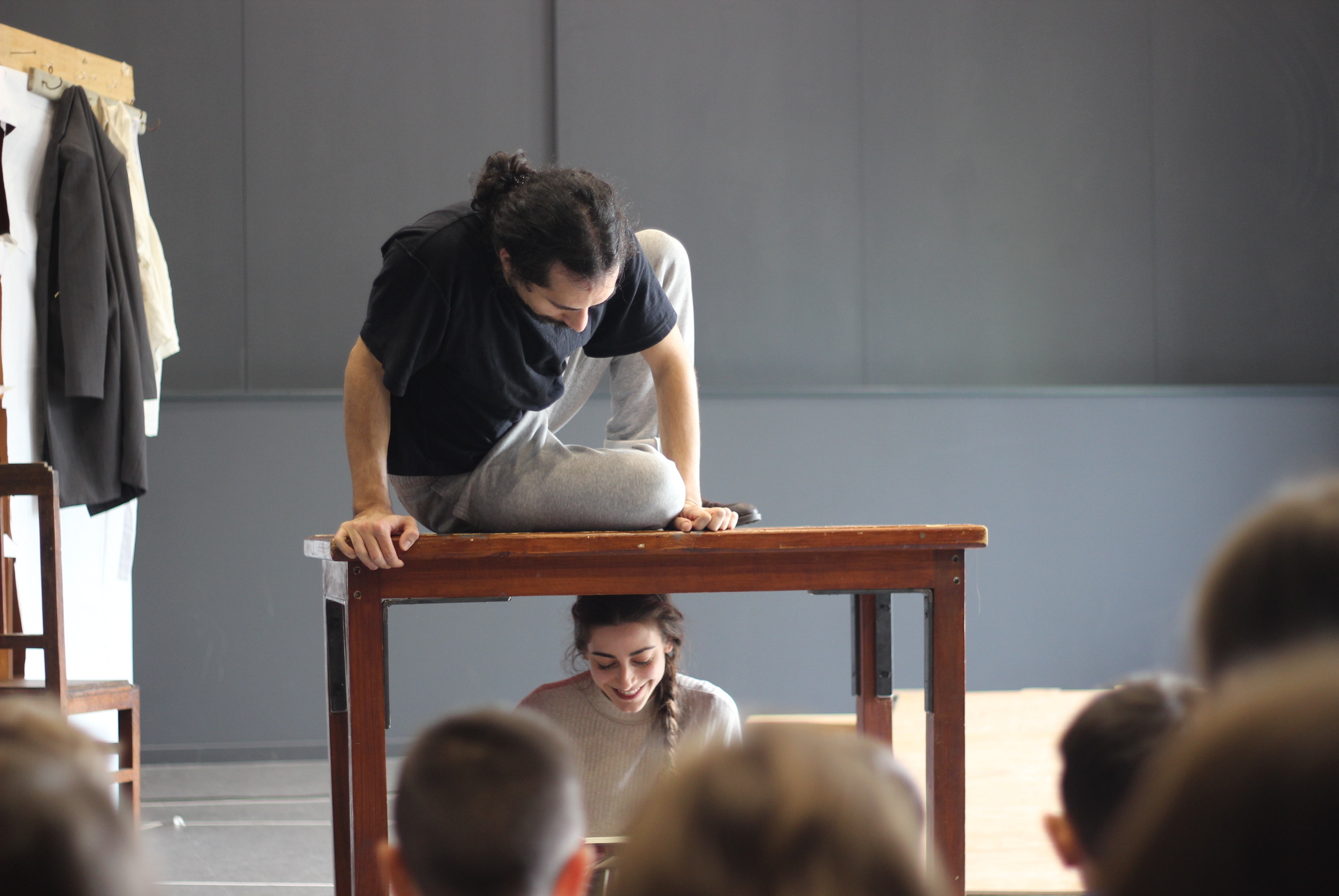 Ao longo do espetáculo, duas personagens servem-se da mesa para viajar entre o passado, o presente e o futuro, convocando os lugares da imaginação e da memória.