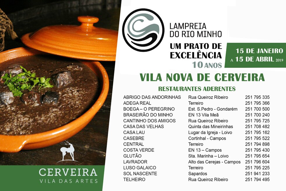 Em território abraçado pelo rio Minho, 15 restaurantes do concelho cerveirense aderiram a este evento da ADRIMINHO - Associação de Desenvolvimento Rural Integrado do Vale do Minho, colocando na sua ementa os sabores únicos deste ciclóstomo até 15 de abril, e que surgem associados a várias experiências culturais.