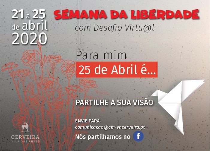 Em período de isolamento e distanciamento sociais, a liberdade não deve ficar confinada. Assim, a iniciativa da Semana da Liberdade com Desafio Virtual pretende incentivar a população a partilhar a sua visão do que foi, é ou será o 25 de Abril, através de diversas artes performativas, como a música, a dança, a literatura, o desenho, o cinema, entre outros.