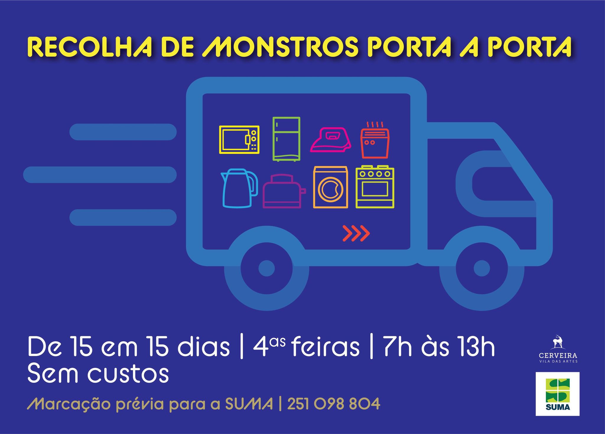 O Município de Vila Nova de Cerveira, em parceria com a SUMA, disponibiliza um serviço gratuito de recolha de monstros (colchões, electrodomésticos, mobílias, etc.) porta a porta, em todas as freguesias do concelho.