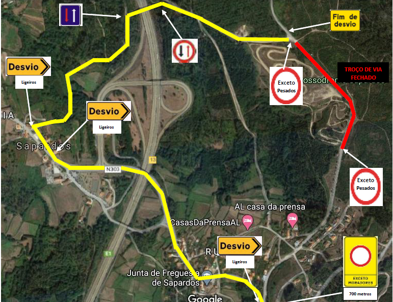 O acesso às freguesias de S. Julião e Silva e Sapardos deverá ser efetuado seguindo a sinalização de Desvio implementada: