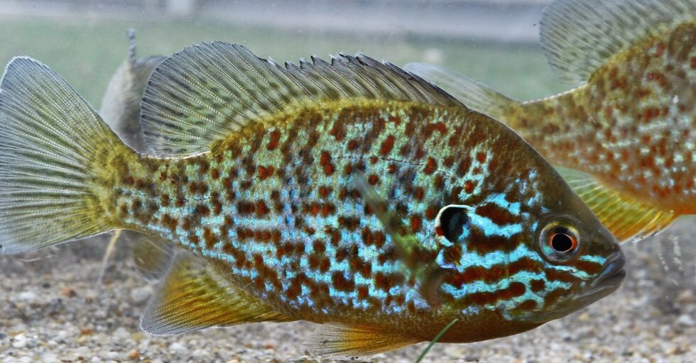 O seu dorso e os flancos são azulados com reflexos verdes e com bastantes pontos escuros, enquanto o ventre é amarelo-alaranjado. Na cabeça, e mais concretamente na parte posterior do opérculo é bem visível uma mancha negra e vermelha.