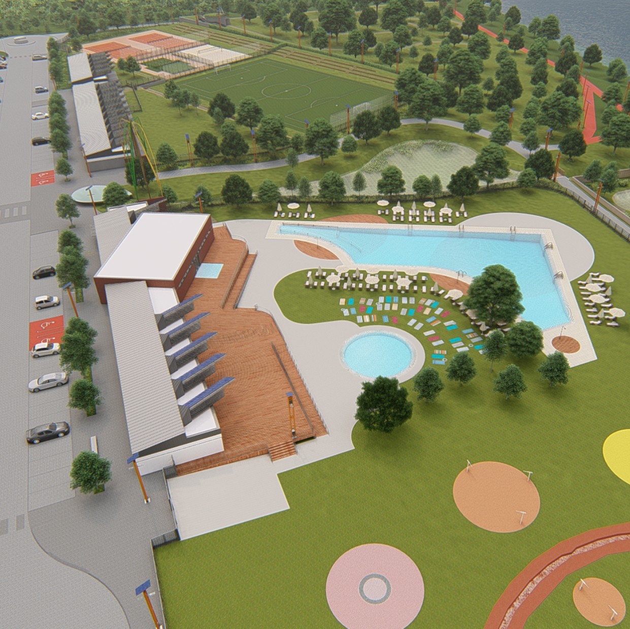 O projeto engloba a construção de novos equipamentos desportivos ao ar livre perfeitamente integrados em espaços verdes de utilização coletiva, como por exemplo duas piscinas descobertas (uma para adultos e outra para crianças), campo de futebol de 7, campos de ténis, campo de padel, campo de voleibol de praia, bem como as respetivas e necessárias instalações de apoio.