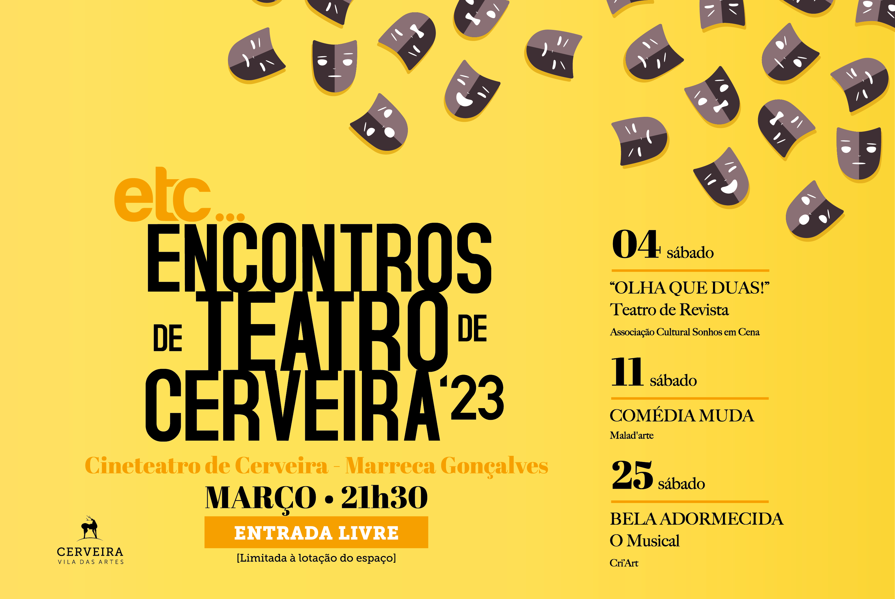 Durante o mês de março, o teatro é a arte performativa de eleição em Vila Nova de Cerveira, como forma de assinalar o Dia Mundial do Teatro (27 de março). Composto por três espetáculos diferentes, o programa dos ETC… Encontros de Teatro de Cerveira’ 23 volta a apostar em três géneros diferentes, sendo um deles uma estreia absoluta em Vila Nova de Cerveira. Ao Teatro de Revista e ao Musical junta-se, pela primeira vez, a Comédia Muda. De entrada livre, as sessões decorrem no Cineteatro de Cerveira – Marreca Gonçalves.