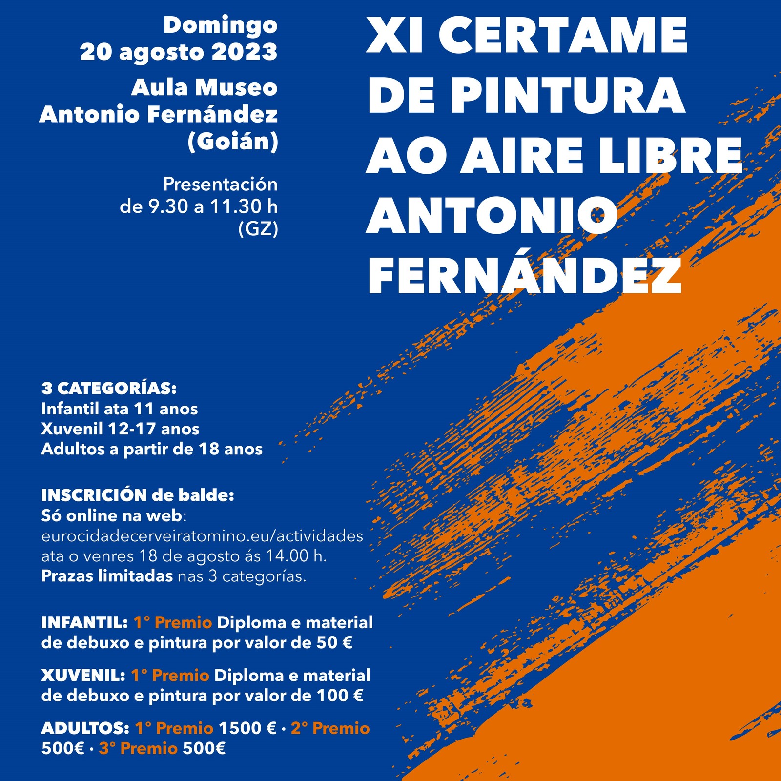 Organizada pela Eurocidade Cerveira-Tomiño, com a colaboração da Fundação Bienal de Arte de Cerveira, a XI edição do Certame de Pintura ao Ar Livre Antonio Fernández está agendada para o dia 20 de agosto. A iniciativa procura aproximar os aficionados pela pintura, desafiando-os a trabalhar in loco uma das paisagem previamente selecionada nas normas do concurso.