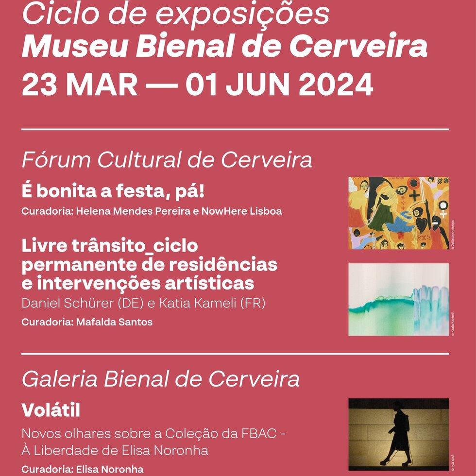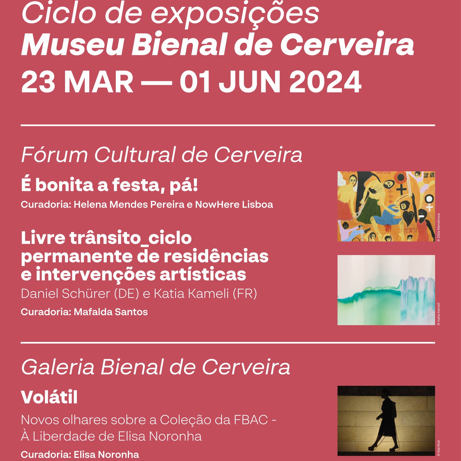 Em 2024 a programação expositiva é composta, à semelhança de 2023, por dois grandes ciclos expositivos. Neste sentido, no dia 23 de março (sábado), o Fórum Cultural de Cerveira e a Galeria Bienal de Cerveira (antigo edifício dos Bombeiros) vão promover a inauguração simultânea de três exposições, num total de 64 artistas representados, com especial enfoque no Brasil, dos quais se destacam nomes como Artur Bárrio, Ícaro Lima, Rosana Ricalde, Tales Frey e Zélia Mendonça.