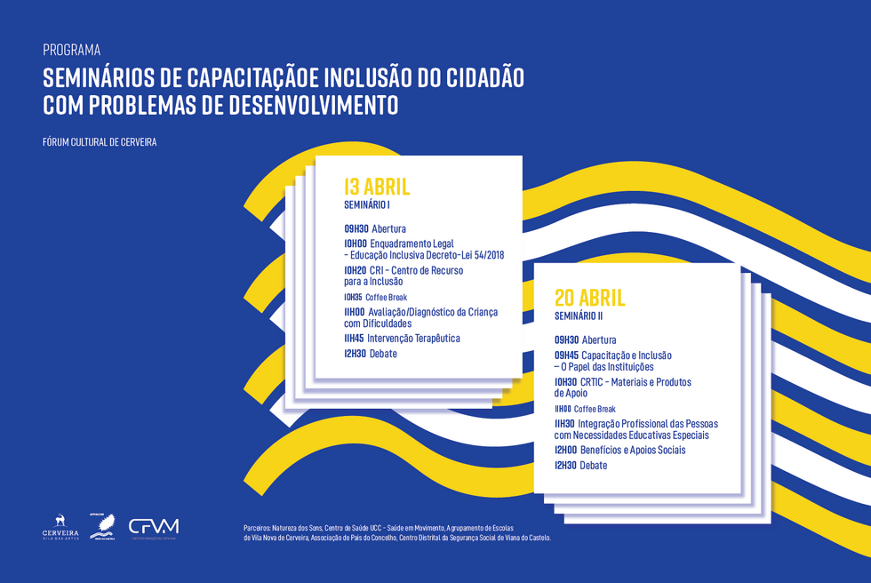 O primeiro seminário, agendado para o dia 13 de abril, reúne um conjunto alargado de oradores, com o objetivo de procurar desmontar muitos estereótipos existentes. Com início às 9h30, no Auditório do Fórum Cultural de Cerveira, a palestra começa por abordar o enquadramento legal da Educação Inclusiva (Decreto-Lei 54/2018), o processo da avaliação e diagnóstico da criança com dificuldades, e a intervenção terapêutica. Já o segundo seminário, no dia 20 de abril, incide sobre o papel das instituições na capacitação e na inclusão, abordar os materiais e produtos de apoio, falar sobre a integração profissional das pessoas com necessidades educativas especiais, além de dar a conhecer os benefícios e apoios sociais existentes.