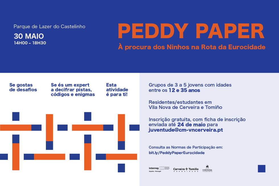 O Peddy-Paper “À procura dos Ninhos na Rota da Eurocidade” decorrerá no centro histórico de Vila Nova de Cerveira, com ponto de encontro no Parque de Lazer do Castelinho, entre as 14h00 e as 18h30.