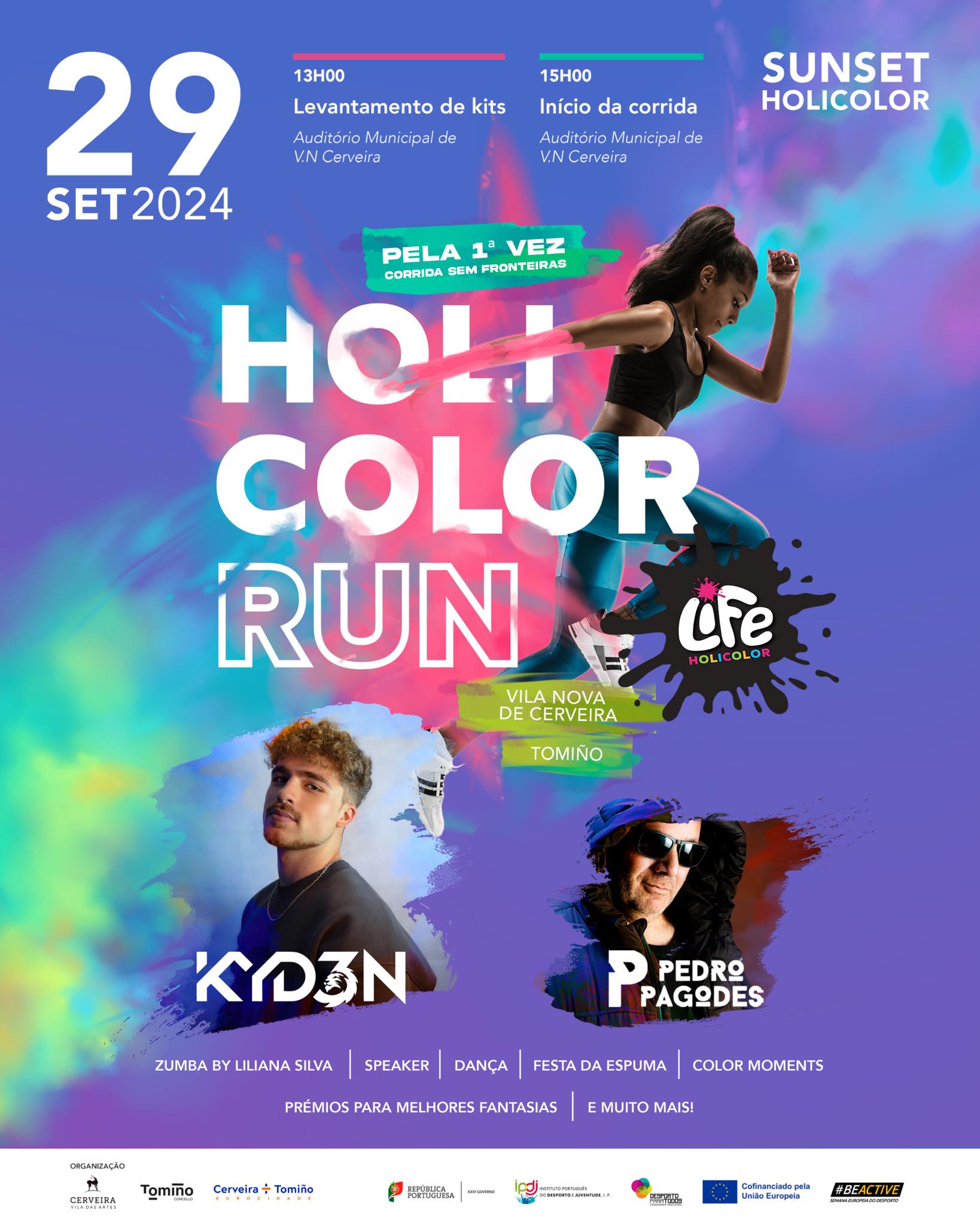 É a primeira corrida HoliColor em Cerveira e a primeira com caráter internacional, com a parceria do Concello de Tomiño (Galiza, Espanha), com passagem na Ponte Internacional da Amizade. São 4kms, com início e fim junto ao Auditório Municipal de Vila Nova de Cerveira. O evento arranca às 15h00 prolongando-se até às 20h00, pois a corrida culmina com o Sunset Holi Color, com a atuação de Kyd3n e Pedro Pagodes, além da dinamização de vários Color Moments, Zumba by Liliana Silva, Festa da Espuma, dança e prémios para as melhores fantasias.