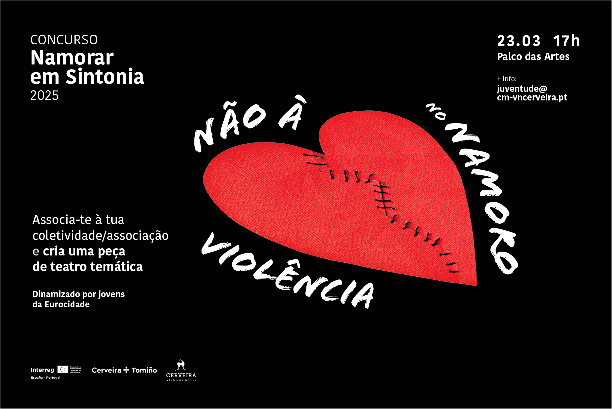 Procurando sensibilizar os jovens dos concelhos vizinhos de Cerveira e de Tomiño para a problemática da violência no namoro, representada por relações tóxicas e comportamentos abusivos, a Eurocidade acaba de lançar as Normas de Participação para o concurso de teatro ‘Namorar em Sintonia’. Objetivo é incentivar grupos de jovens a trabalhar a temática, de uma forma crítica, criativa e interativa, através de uma peça de teatro original a ser apresentada a 23 de março, no Palco das Artes.