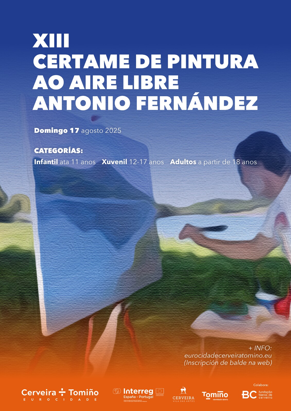 As ruas de Tomiño e Vila Nova de Cerveira voltam a receber cavaletes, telas e artistas com muita criatividade, no XIII Concurso de Pintura ao Ar Livre Antonio Fernández, a 17 de agosto, organizado pela Eurocidade Cerveira-Tomiño, com a colaboração da Fundação Bienal de Arte de Cerveira e da Comunidade de Baldios de Goián. O concurso chega à sua décima terceira edição com o objetivo de continuar a aproximar os amantes da pintura da paisagem envolvente, para que retratem ao vivo os cenários e acontecimentos dos diferentes pontos marcados nos percursos em ambas as margens do rio Minho.