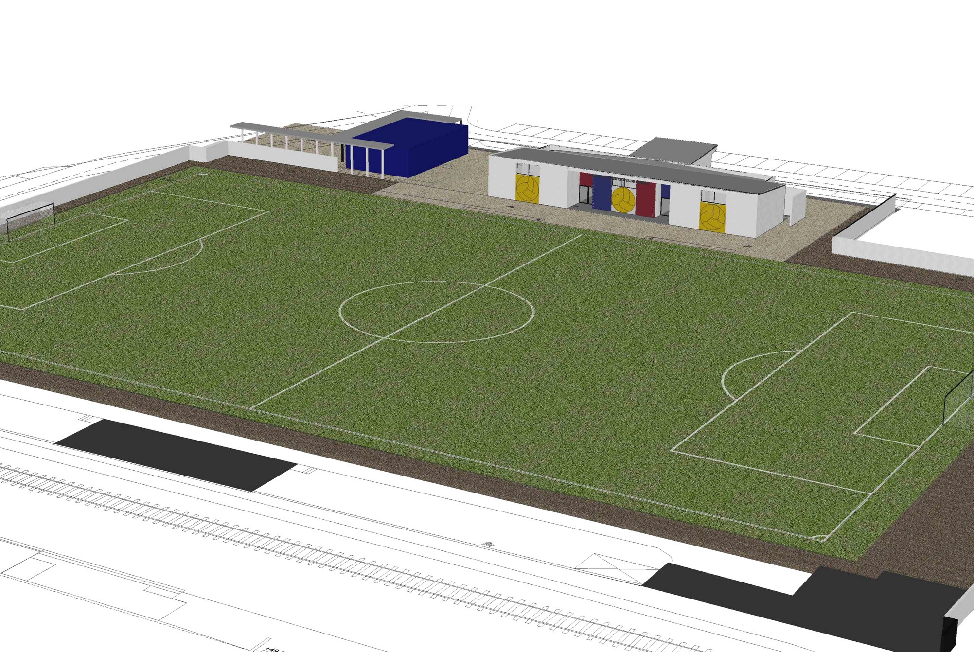 A primeira fase está a ser ultimada com a construção de dois balneários/vestiários, reservando espaço para a implantação de um terceiro. Considerando que se trata de instalações desportivas de base formativa destinadas também à realização de competições, foi ainda construído vestiários/balneários para árbitros independentes dos treinadores e monitores, assim como um posto de primeiros socorros e de apoio médico. Em 2017, está prevista a segunda fase com a instalação do relvado sintético.