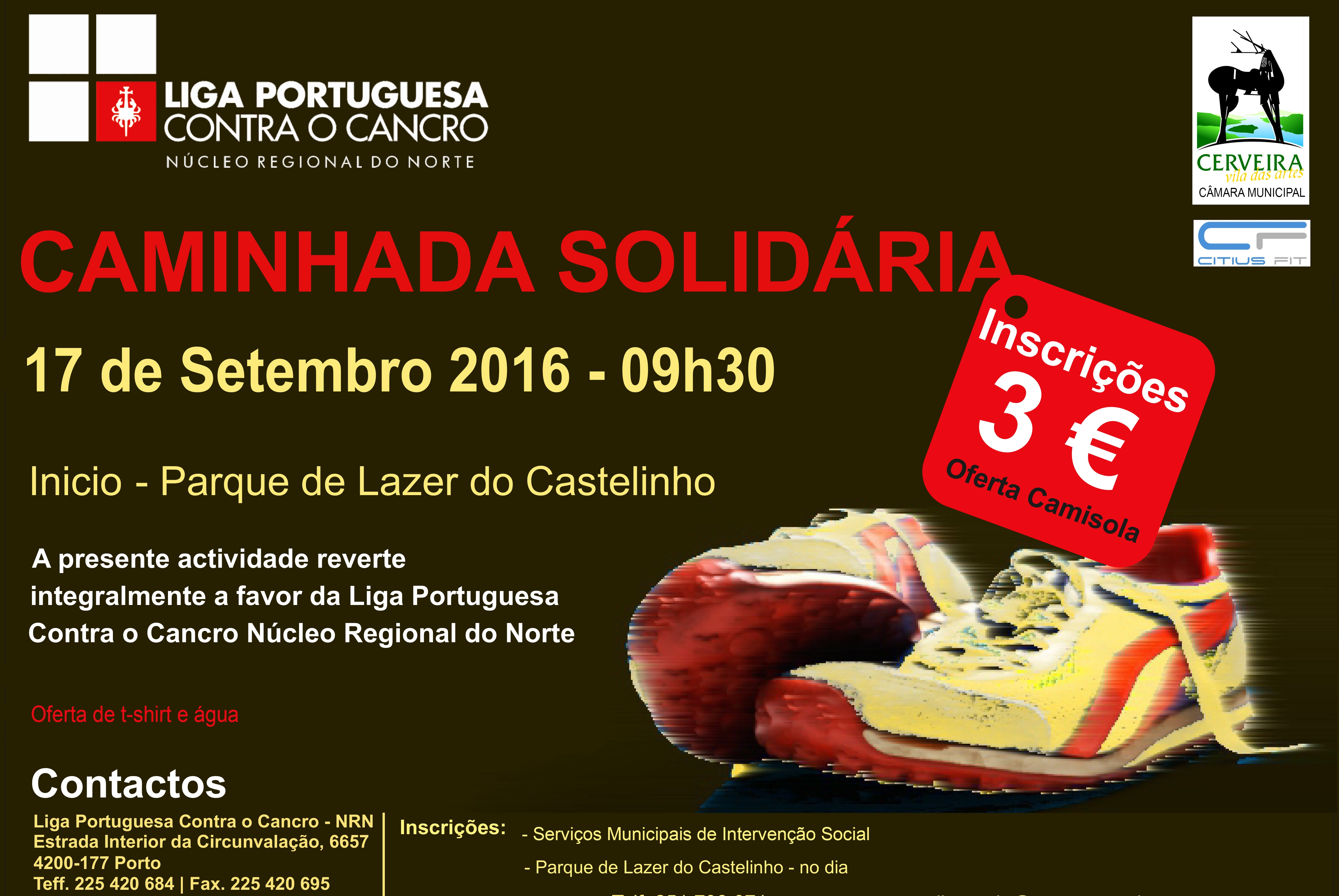 Está agendada para dia 17 de setembro, mais uma Caminhada Solidária em prol da Liga Portuguesa Contra o Cancro (LPCC), em Vila Nova de Cerveira. Com partida às 09h00, do Parque de Lazer do Castelinho, os interessados devem efetuar inscrição nos SMIS ou no próprio local, cuja receita reverte na totalidade para aquela instituição.