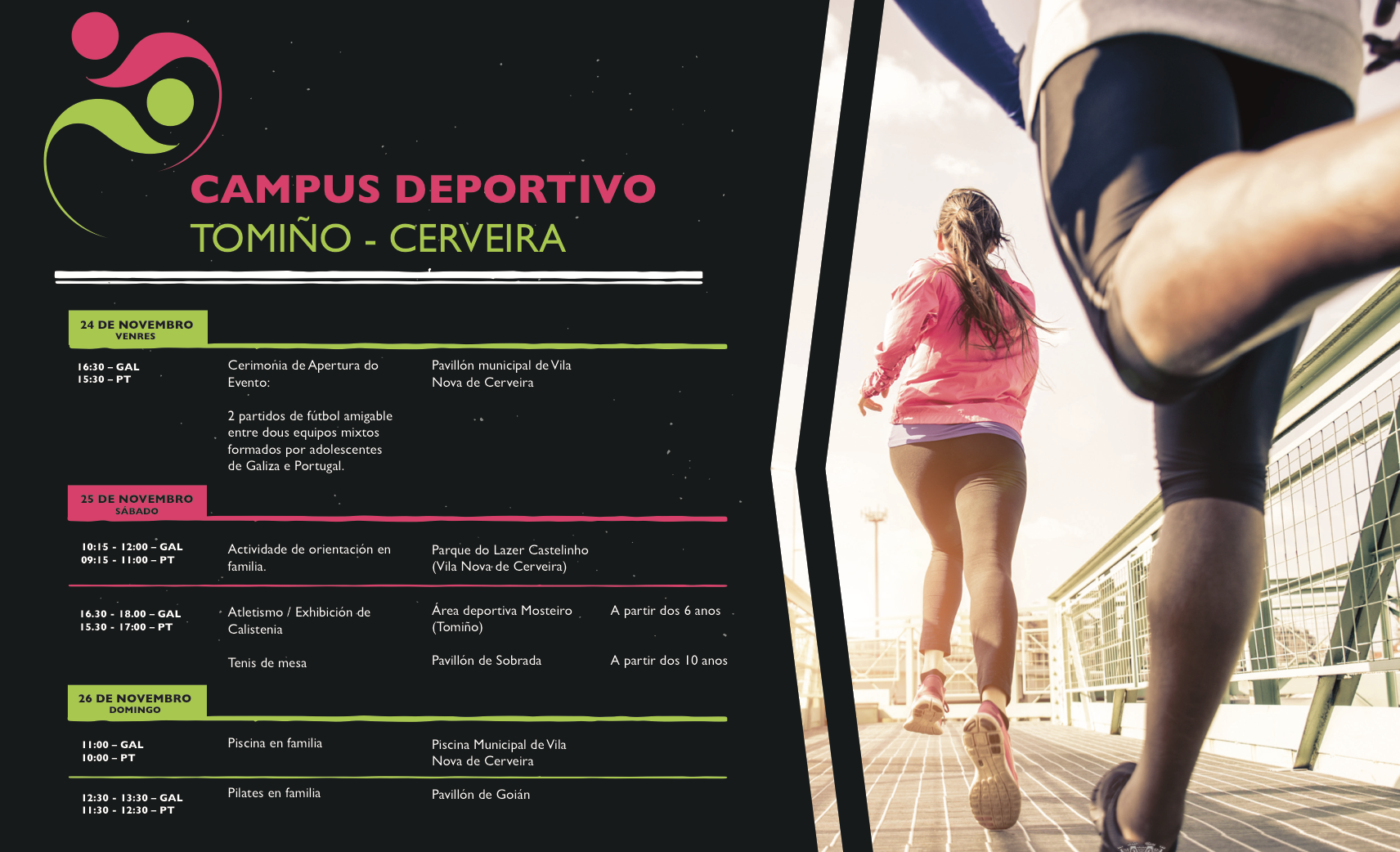 - Sábado, 25 de novembro, a manhã fica reservada para uma atividade de orientação em família no Parque do Lazer Castelinho, em Vila Nova de Cerveira. No período da tarde, a iniciativa volta ao concelho de Tomiño, para acolher uma ação de atletismo e uma exibição de ‘calistenia’ na área desportiva de Mosteiro e outra de ténis de mesa no Pavilhão de Sobrada.