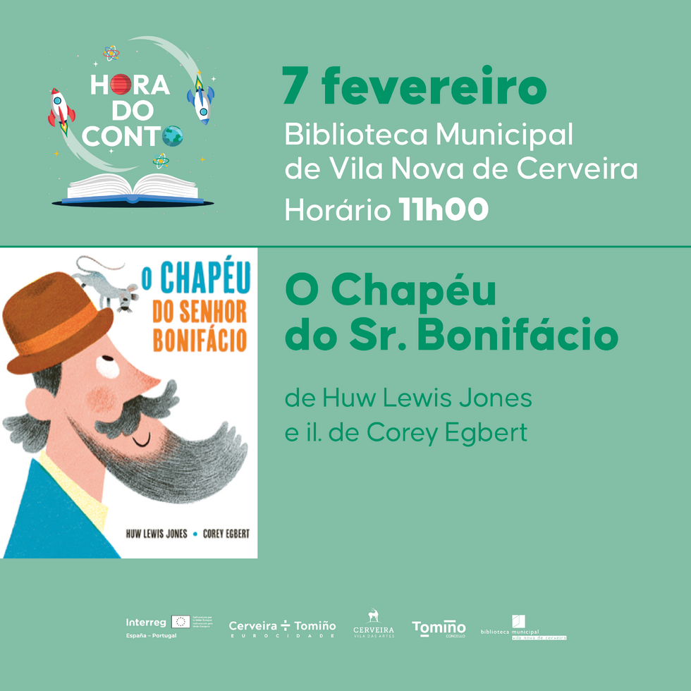 “O Chapéu do Sr. Bonifácio”, autoria de Huw Lewis Jones e ilustrações de Corey Egbert