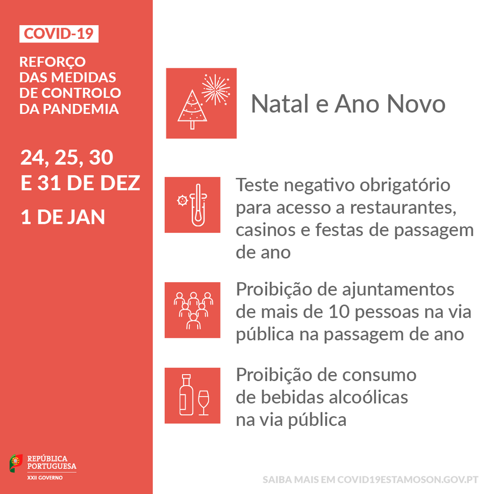 - Teste negativo obrigatório (Antigénio ou PCR) para acesso a restaurantes, casinos e festas de passagem de ano;